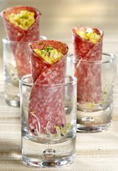 Coloca los cucuruchos de salami en un mini-vasito o platito y decorar con perejil picado.