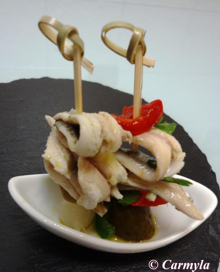 Tapa fria: BARQUITOS Feb12 BARQUITOS Descripción: banderillas de anchoas en vinagre (ver receta) , decoradas con cebolletas , aceitunas, pepinillo y pimiento en vinagre o aceite. Compartir Haz clic para compartir en Facebook (Se abre en una ventana nueva) Facebook Haz clic para compartir en X (Se abre en una ventana nueva) X Haz clic para compartir en Pinterest (Se abre en una ventana nueva) Pinterest Más Haz clic para compartir en LinkedIn (Se abre en una ventana nueva) LinkedIn Haz clic para compartir en Tumblr (Se abre en una ventana nueva) Tumblr Haz clic para imprimir (Se abre en una ventana nueva) Imprimir Haz clic para enviar un enlace por correo electrónico a un amigo (Se abre en una ventana nueva) Correo electrónico Me gusta Cargando... Relacionado