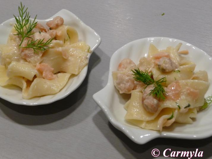 DESCRIPCIÓN: pasta con gambas y salmón ahumado acompañada de salsa a base de hinojo y queso roquefort