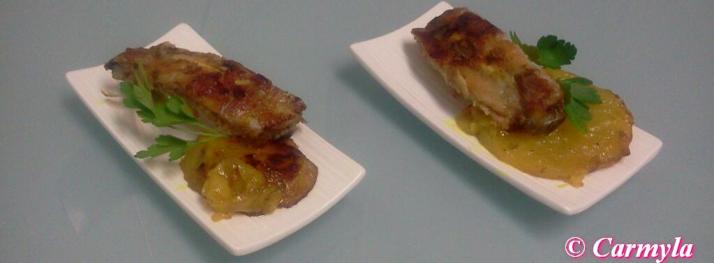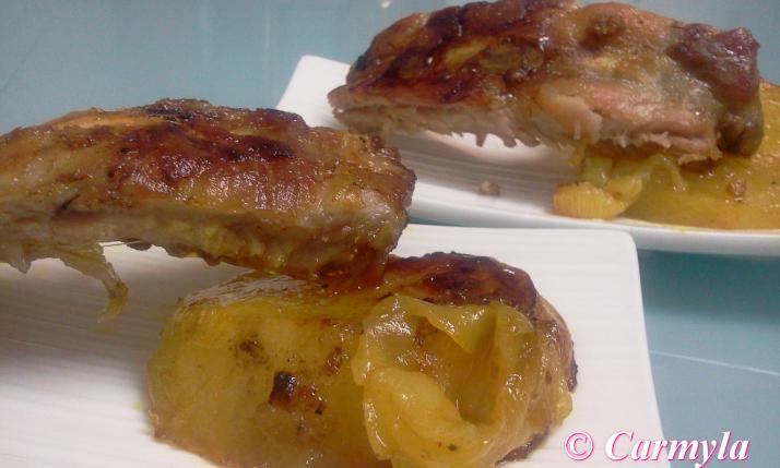 DESCRIPCIÓN: costillas asadas con curry y vinagre balsámico de Módena acompañadas de patatas a la panadera