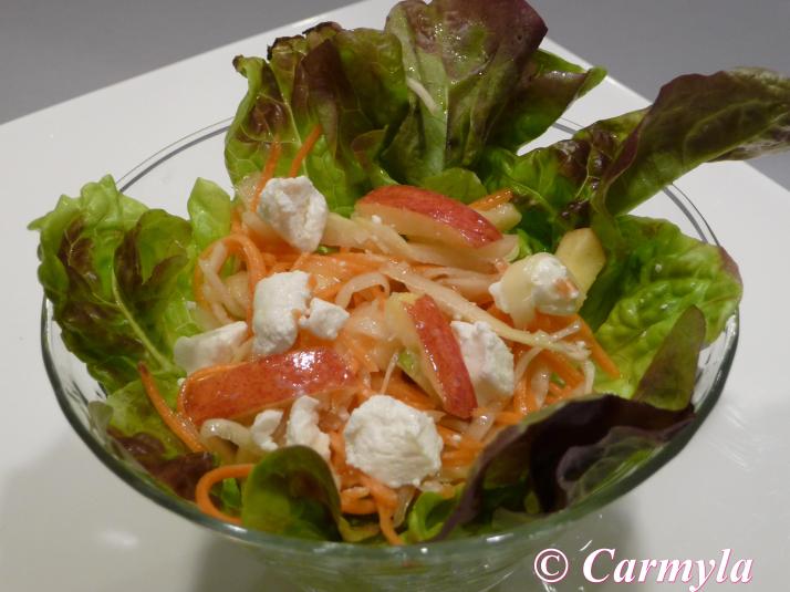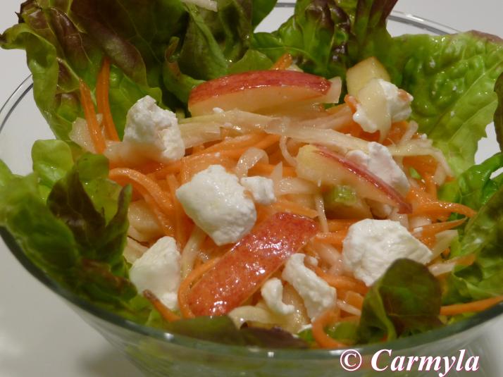 DESCRIPCIÓN: ensalada de lechuga, zanahoria, col blanca y manzana con queso de cabra y vinagreta de miel.