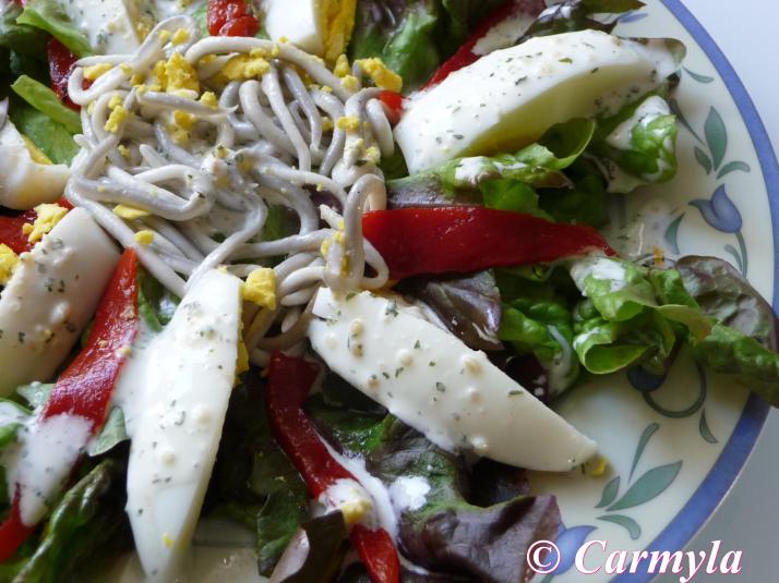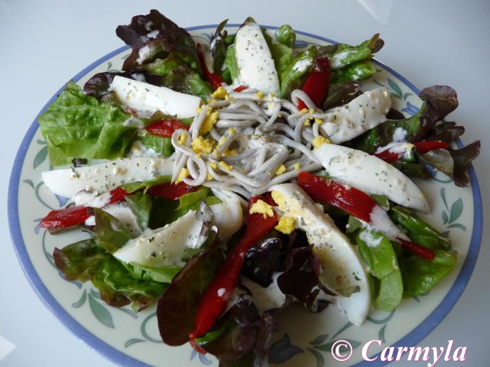 DESCRIPCIÓN: ensalada de lechuga de roble con gulas al ajillo, huevo cocido, pimiento del piquillo y alioli