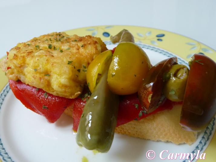 - Coloca un pimiento del piquillo abierto sobre cada rebanada de pan de baguette y ponle un poco de sal.