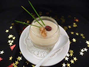 • Sírve la crema en los vasitos y decora cada uno de ellos con ¼ de nuez, una avellana y unas ramitas de cebollino o perejil en rama.