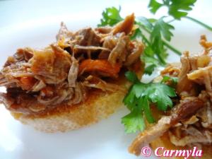 • Para montar la tapa, pon 2 cucharadas colmadas de “cordero al chilindrón” sobre una rebanada de pan de baguette. Decórala con una ramita de perejil (ver fotos).