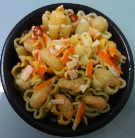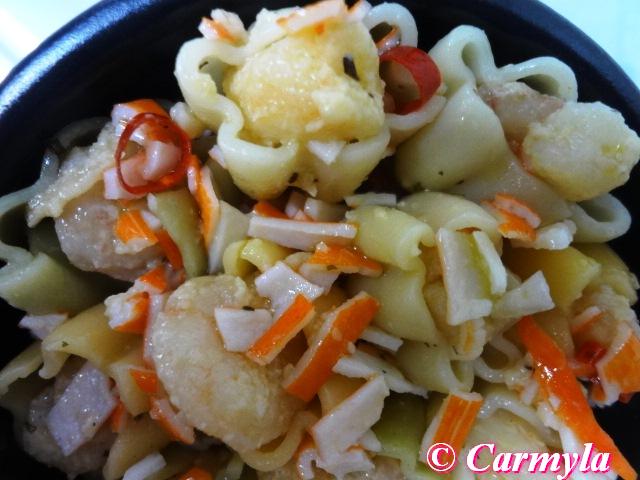 La mezcla de gambas al ajillo, palitos de chaca y huevo duro le da a la pasta un sabor delicioso.