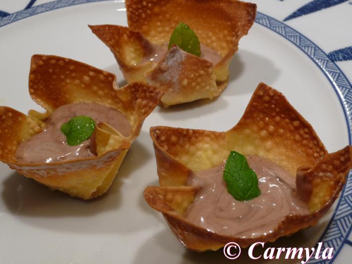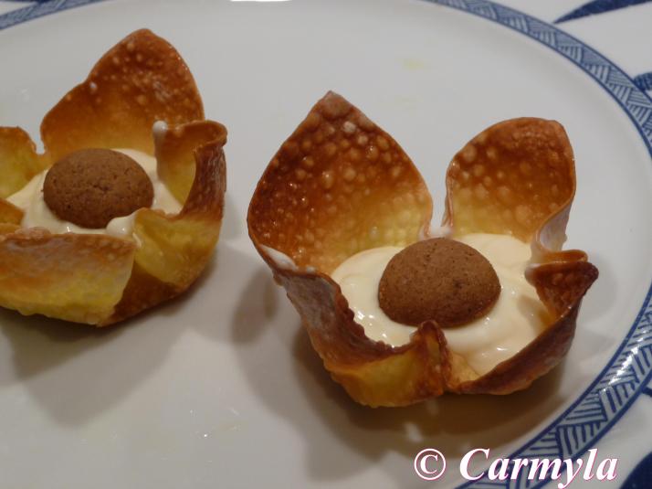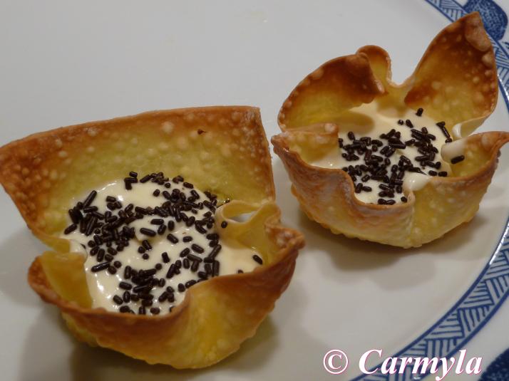 Mira en la lista de ingredientes de la receta. Ahí está el enlace para ir a la receta de «cestas wonton dulces» donde explico paso a paso cómo se hacen. Por cierto, que no van fritas, van al horno. Y quedan para chuparse los dedos!!. Un beso