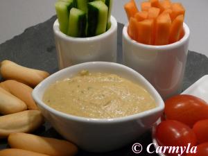 - Sirve el humus en el centro de un plato acompañado de unos tomates cherry, unos colines y unos palitos de zanahoria y pepino (ver foto).