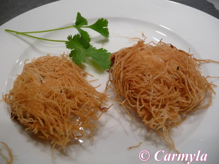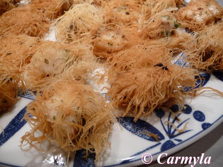 Si te digo la verdad, me han quedado espectaculares tanto de presencia como de sabor. Al freir el kadaif (normalmente lo hacen al horno con almibar), queda supercrujiente y su sabor recuerda un poco al de los churros pero en salado.