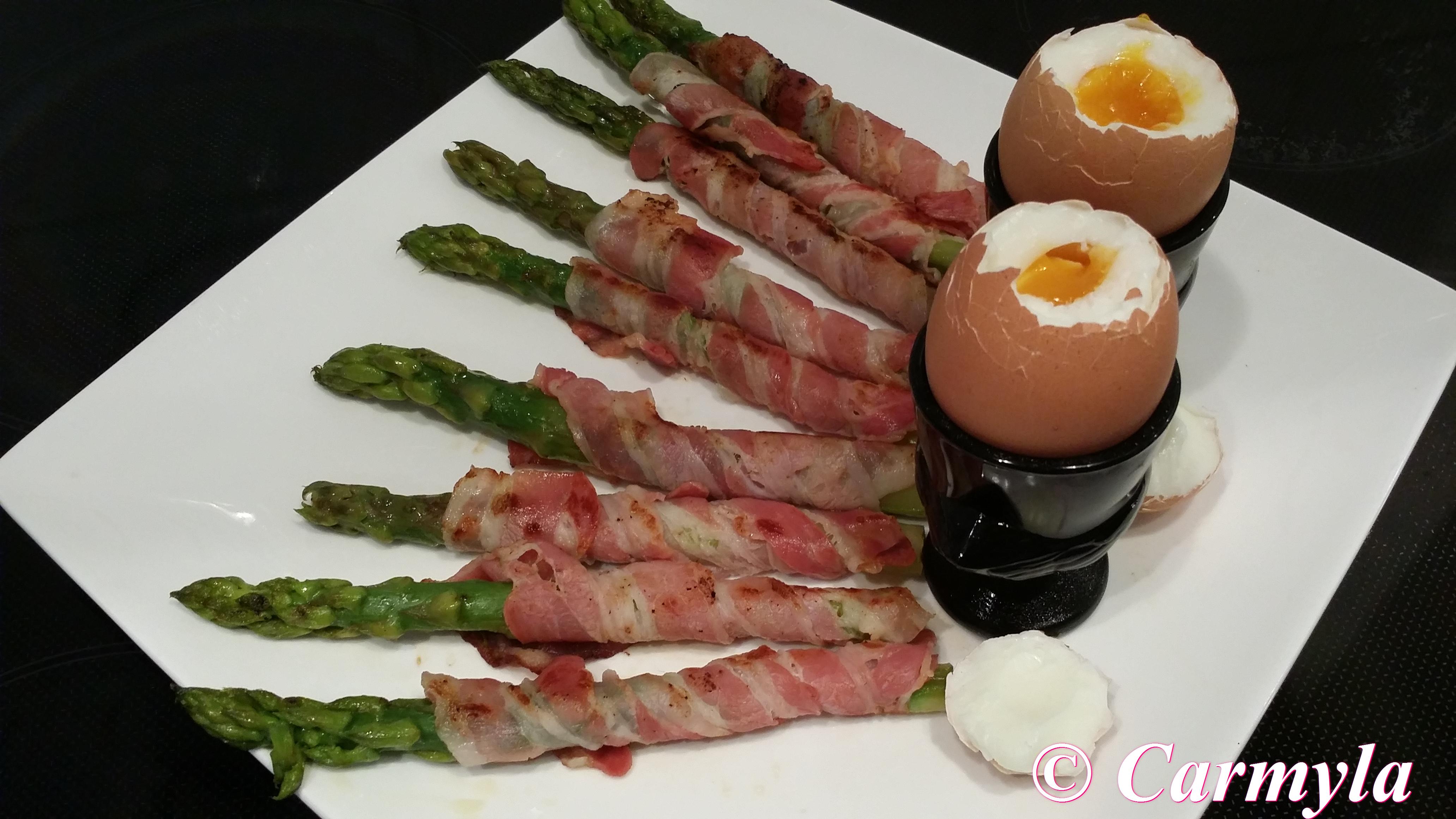 DESCRIPCIÓN: espárragos verdes fritos, envueltos en bacon y acompañados por huevos pasados por agua.