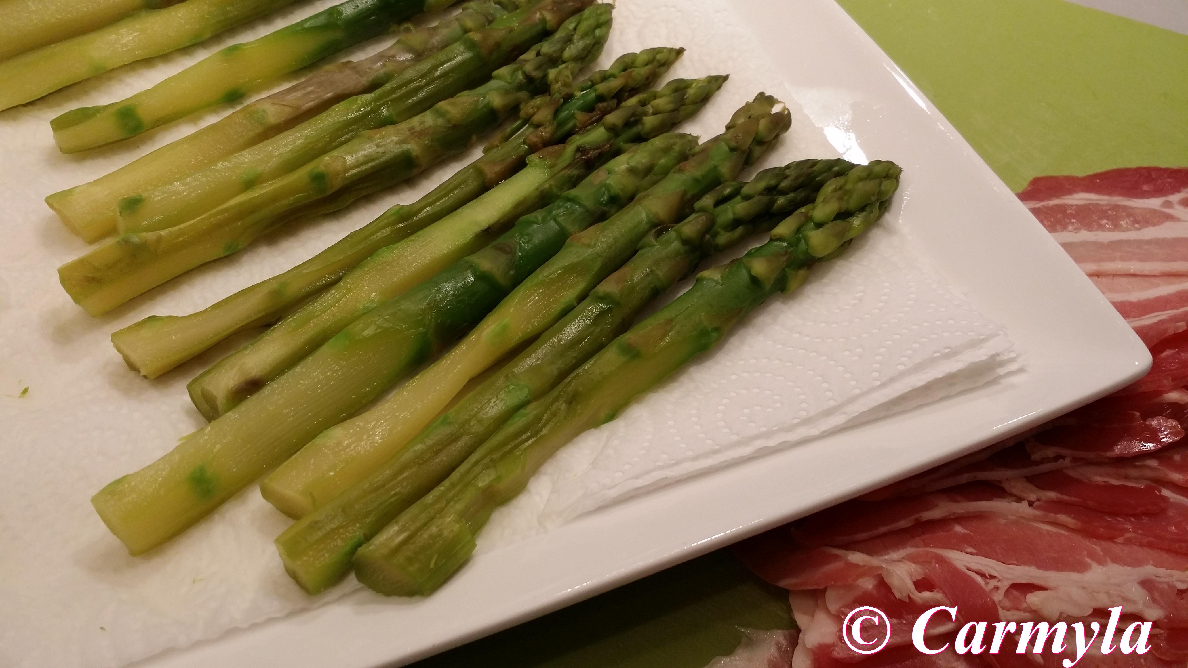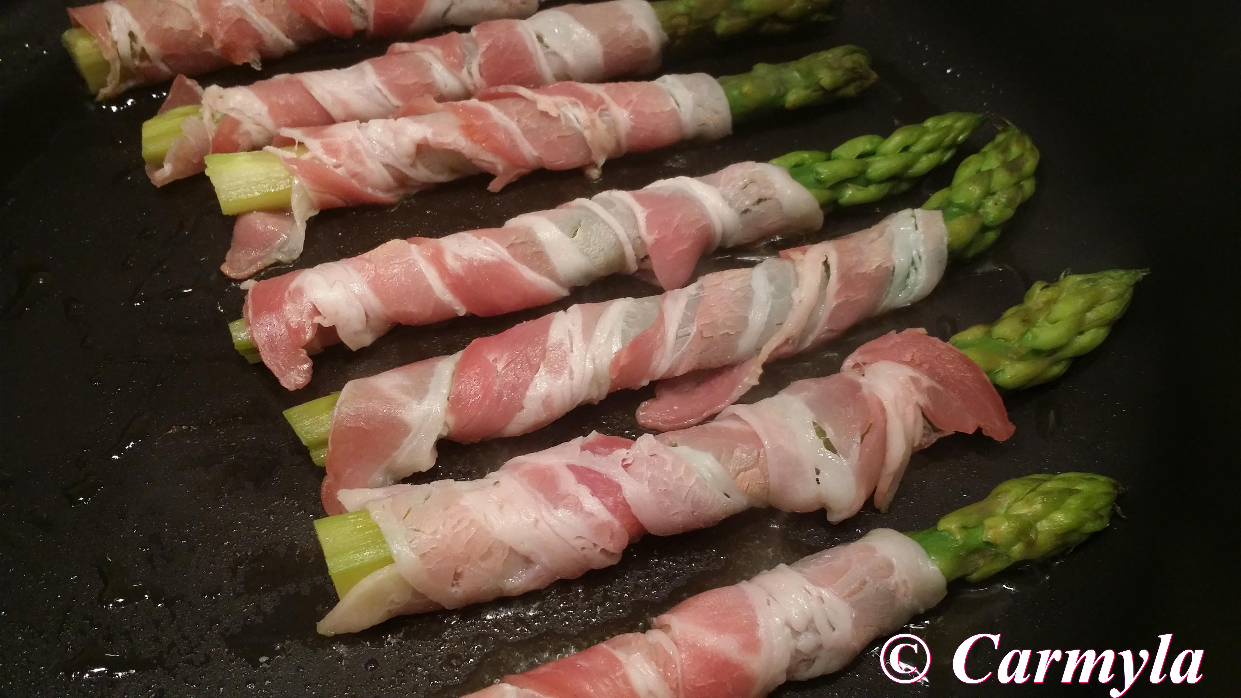 - Pon a calentar, a fuego medio-alto, el aceite y fríe los espárragos hasta que el bacon quede dorado).