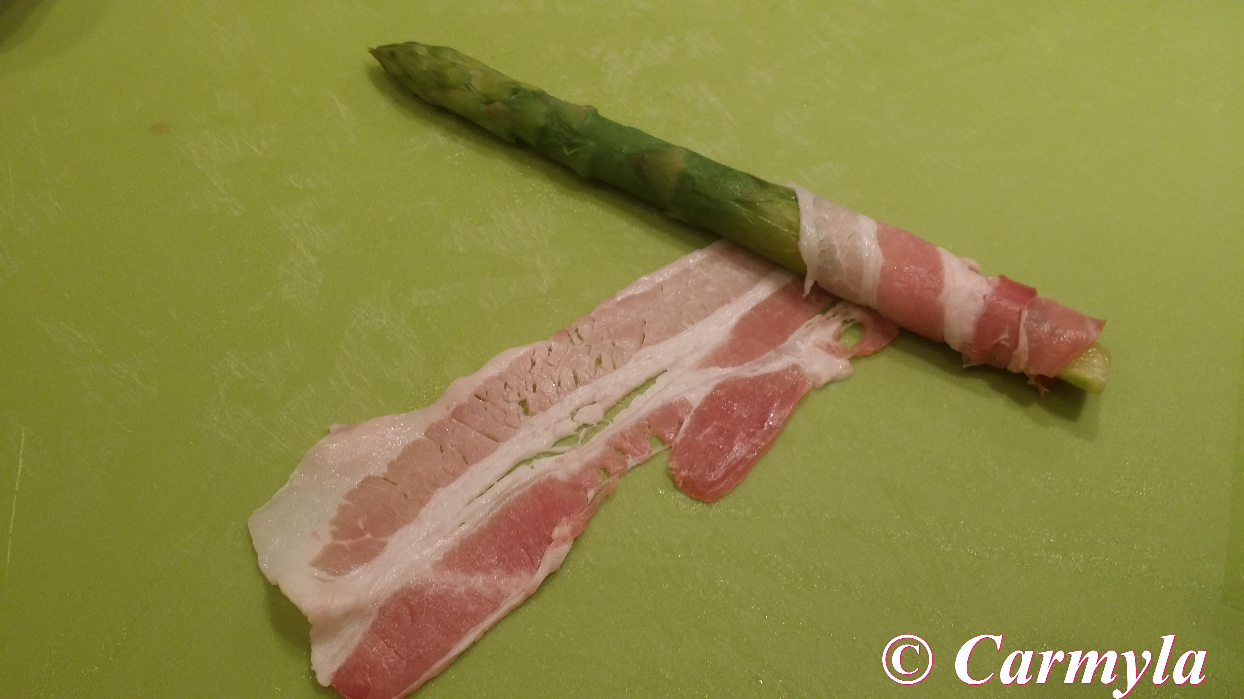 - Extiende 1 loncha de bacon sobre una tabla de cortar y enrolla en ella 1 espárrago. Haz lo mismo con el resto de los espárragos).