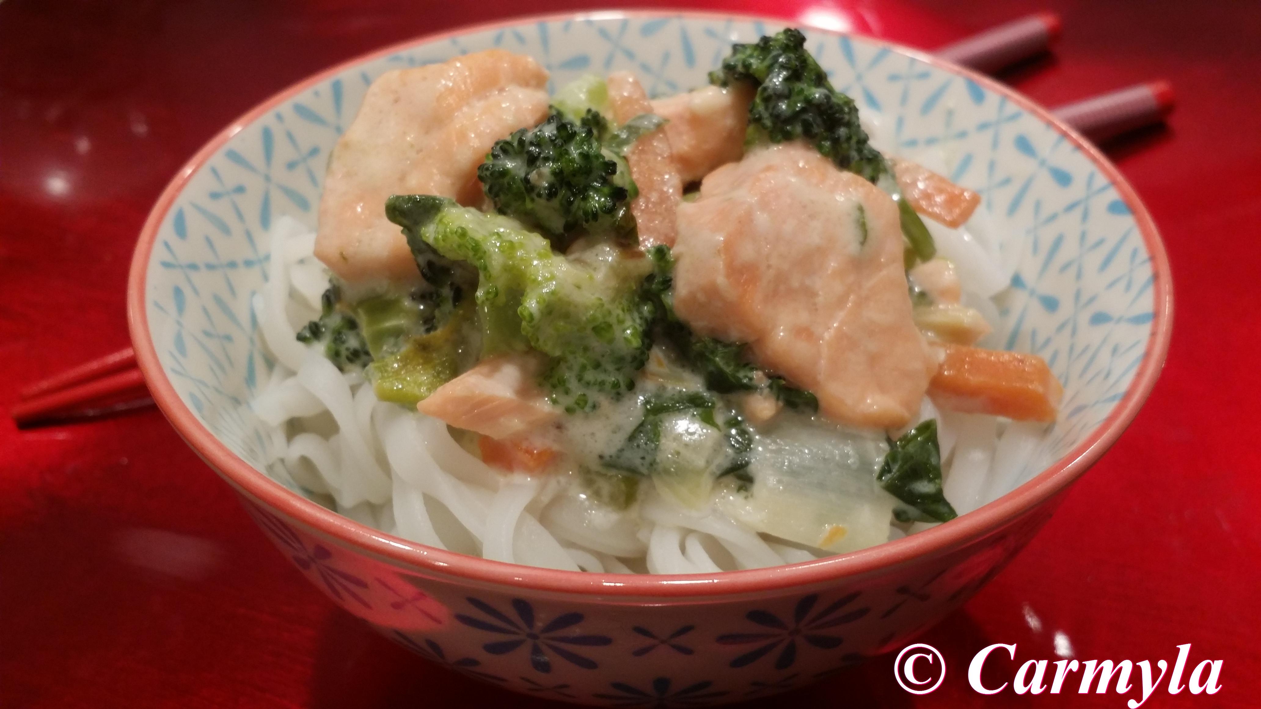 DESCRIPCIÓN: pasta de arroz con salmón fresco, queso gorgonzola y verduras