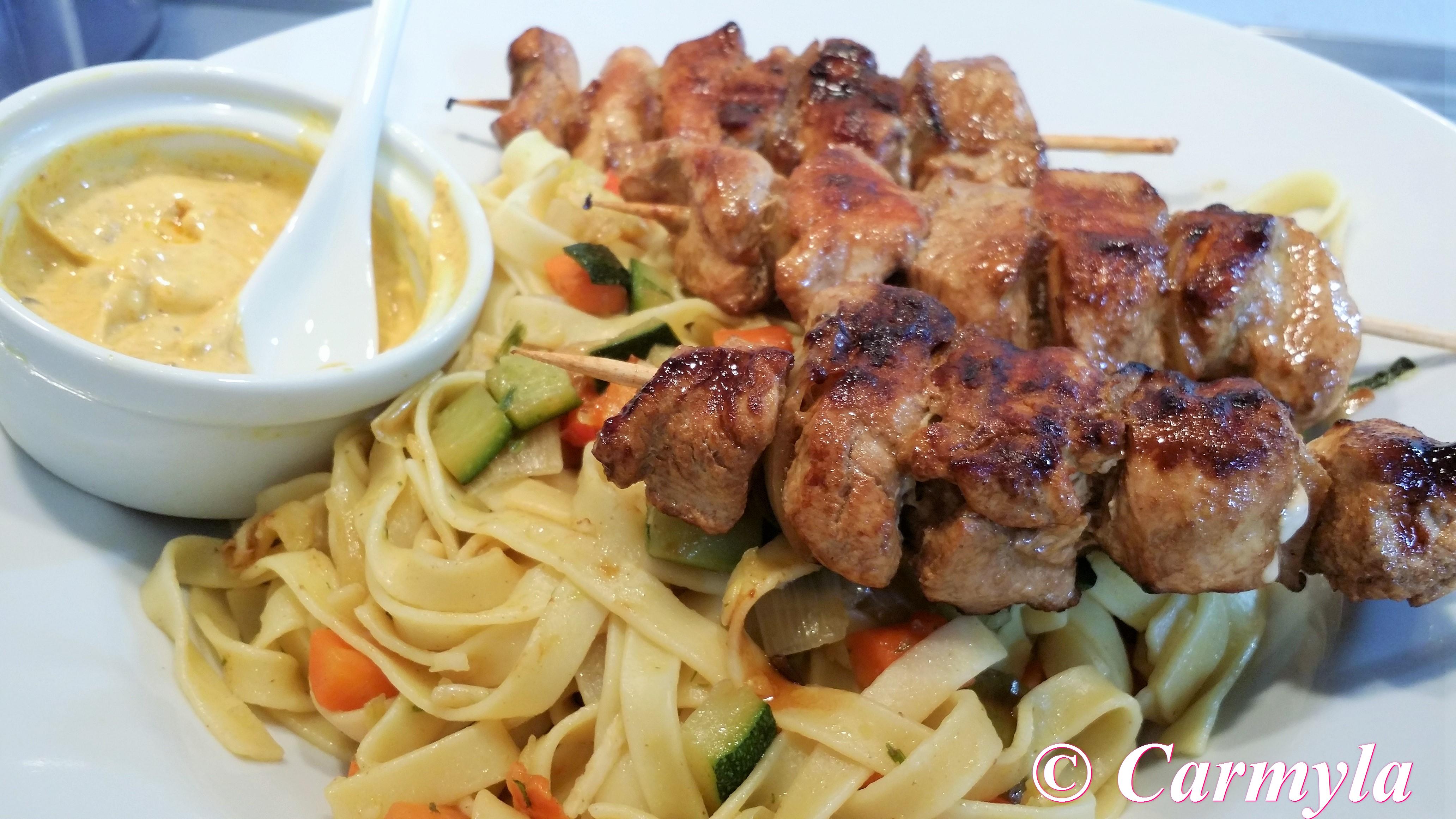 BROCHETAS ORIENTALES DE POLLO SOBRE CAMA DE TALLARINES CON VERDURAS
