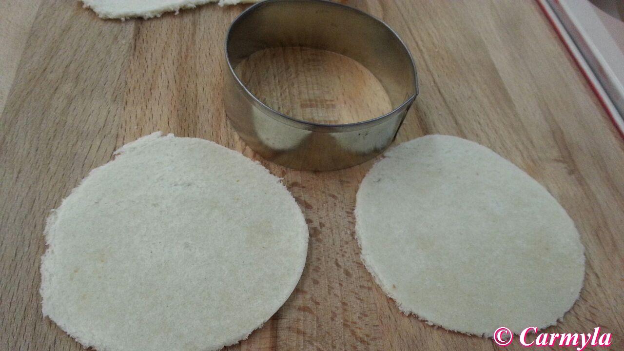 - Corta 12 círculos de pan con ayuda de un aro de emplatar de unos 8 cm de diámetro.