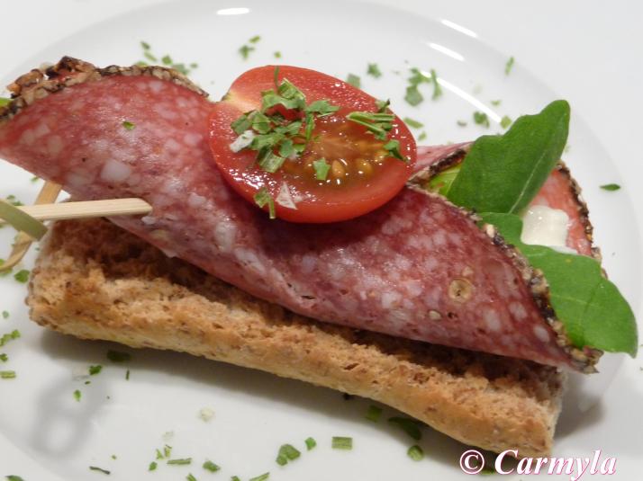 - Para servir el “abanico se salami”, coloca los triángulos de salami formando un abanico y acompáñalos de la salsa de mostaza y miel.