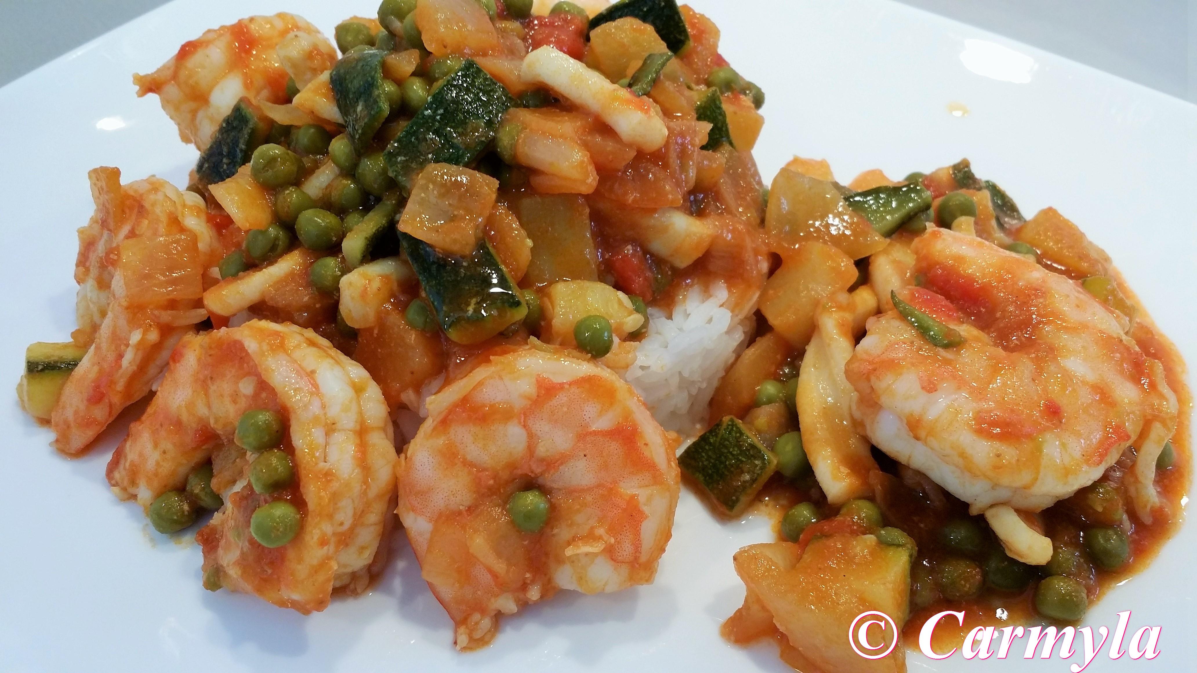 DESCRIPCIÓN: langostinos cocinados con verduras y acompañados de arroz